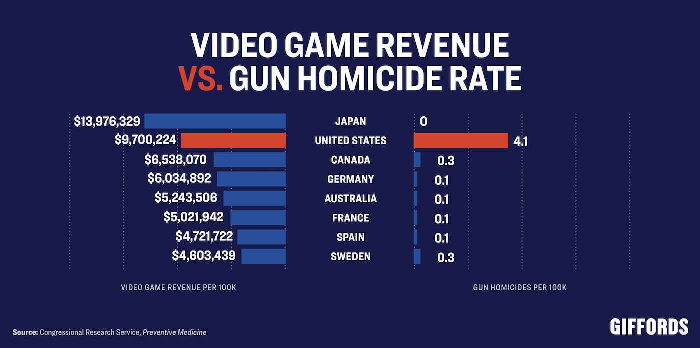 Additionally, a report from the nonpartisan Congressional Research Service found that other countries consume video games at similar—and in some cases higher—rates than the United States. But none of these countries have higher rates of gun violence. Clearly, violent video games don’t explain why the US has the highest rate of gun deaths and mass shootings among comparable high-income countries.