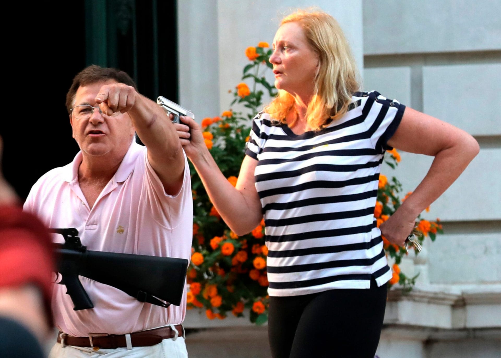 Many of these armed white protesters are strong supporters of the president who is quick to defend them. The white man who killed two protesters in Wisconsin before fleeing the scene was spotted at a Trump rally earlier this year. The McCloskeys from Missouri were given a star turn at the Republican National Convention after pointing guns at Black Lives Matter protesters who were walking by their house in June.