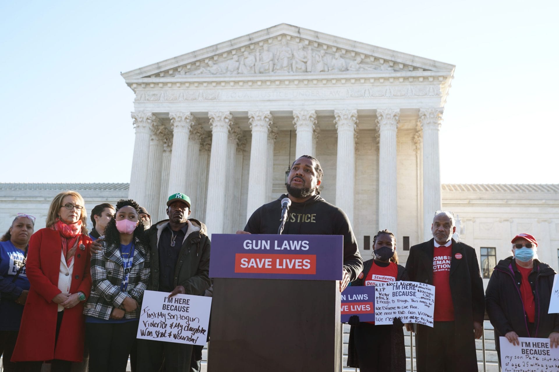 Gun violence survivors speak at a rally outside of the US Supreme Court in November 2021.
